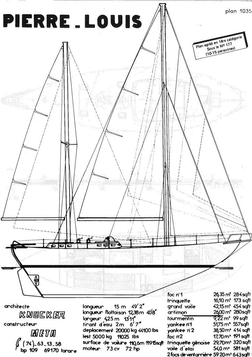 Sa coque en acier et son déplacement lourd, 25t, lui confère de grande qualité de robustesse et de tenue à la mer. Son gréement divisé permet un grande manœuvrabilité même en équipage réduit, et permet d’établir de grandes surfaces de voiles quand les conditions le permettent.